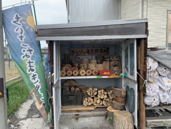 無人販売で薪やトーチ、薪割り台などを売っています。