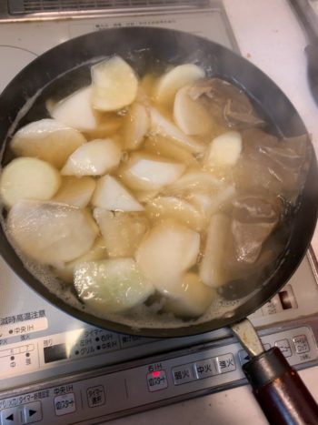 あとは鍋に水をはり、乱切りした大根をいれて煮ていきます。
