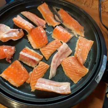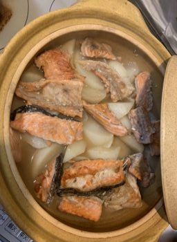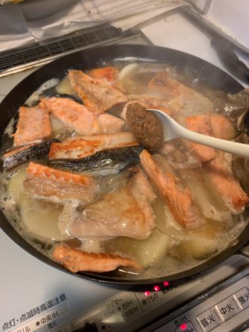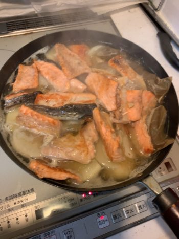 ポイント:焼いた時に出るサーモンの油も鍋に入れる。