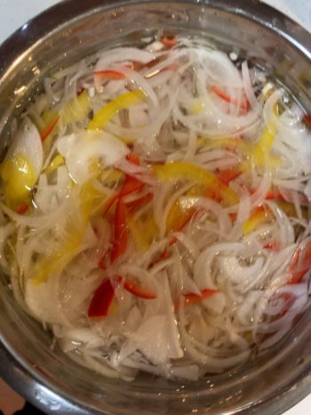 さらしていた玉ねぎ・パプリカの水を切り、マリネ漬地にいれます。