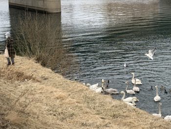 みんな川の中にいるのに1羽だけ陸の上に.......
