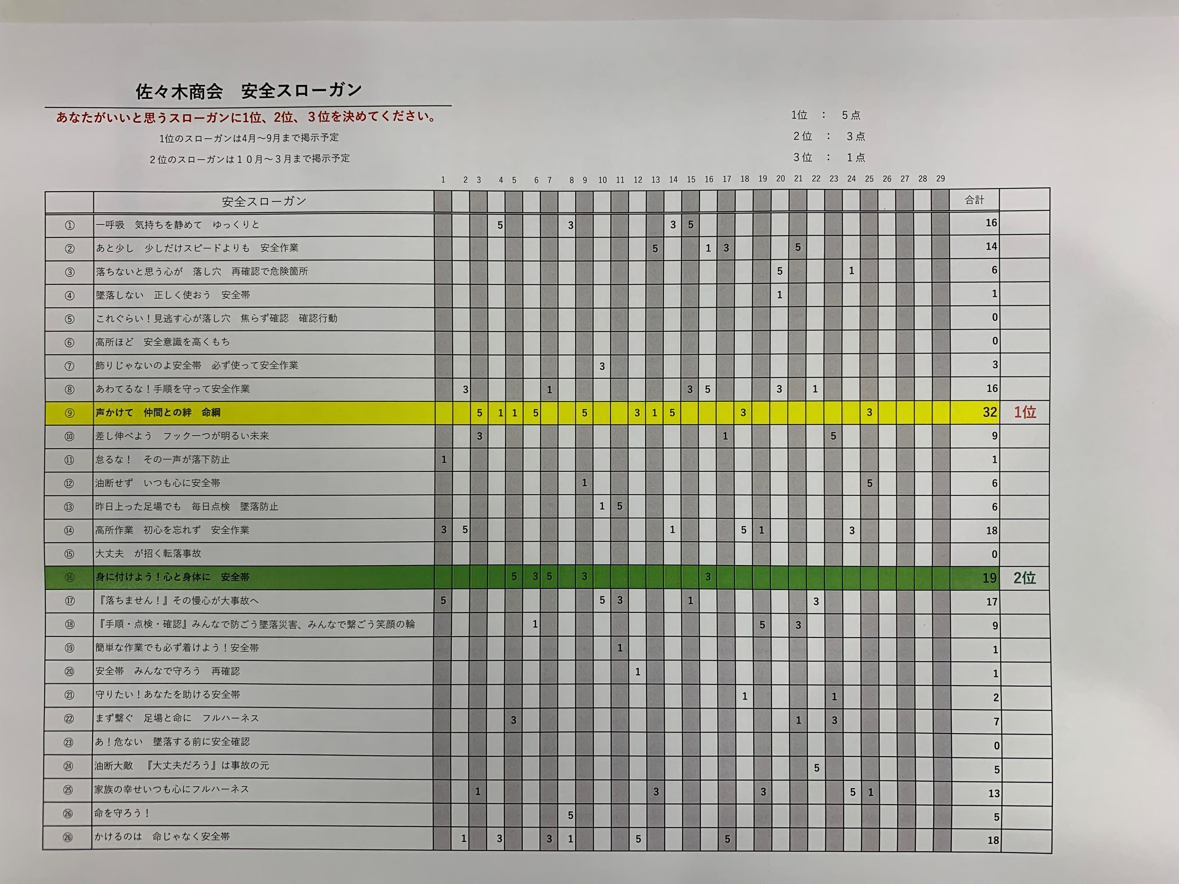2021年度佐々木商会 安全スローガンが投票により決定しました。