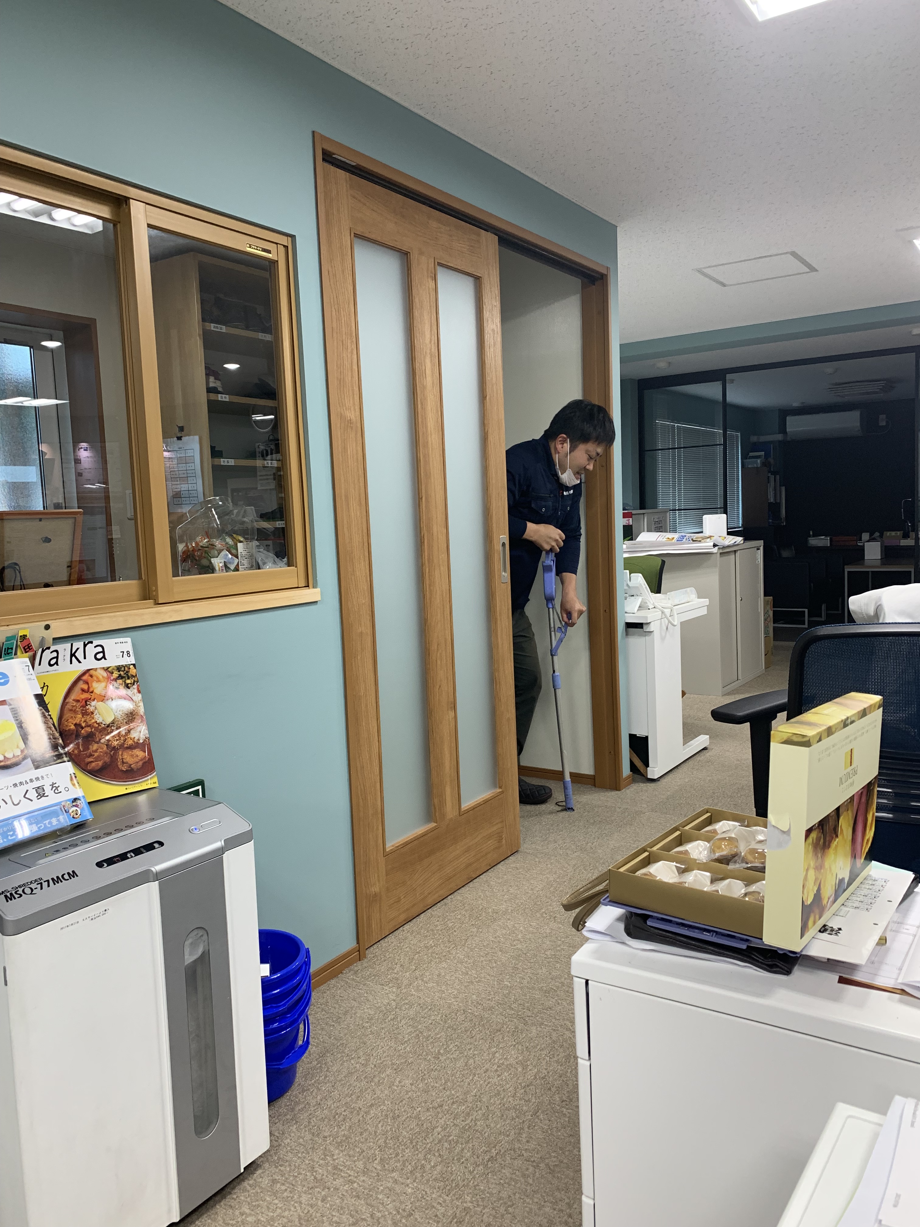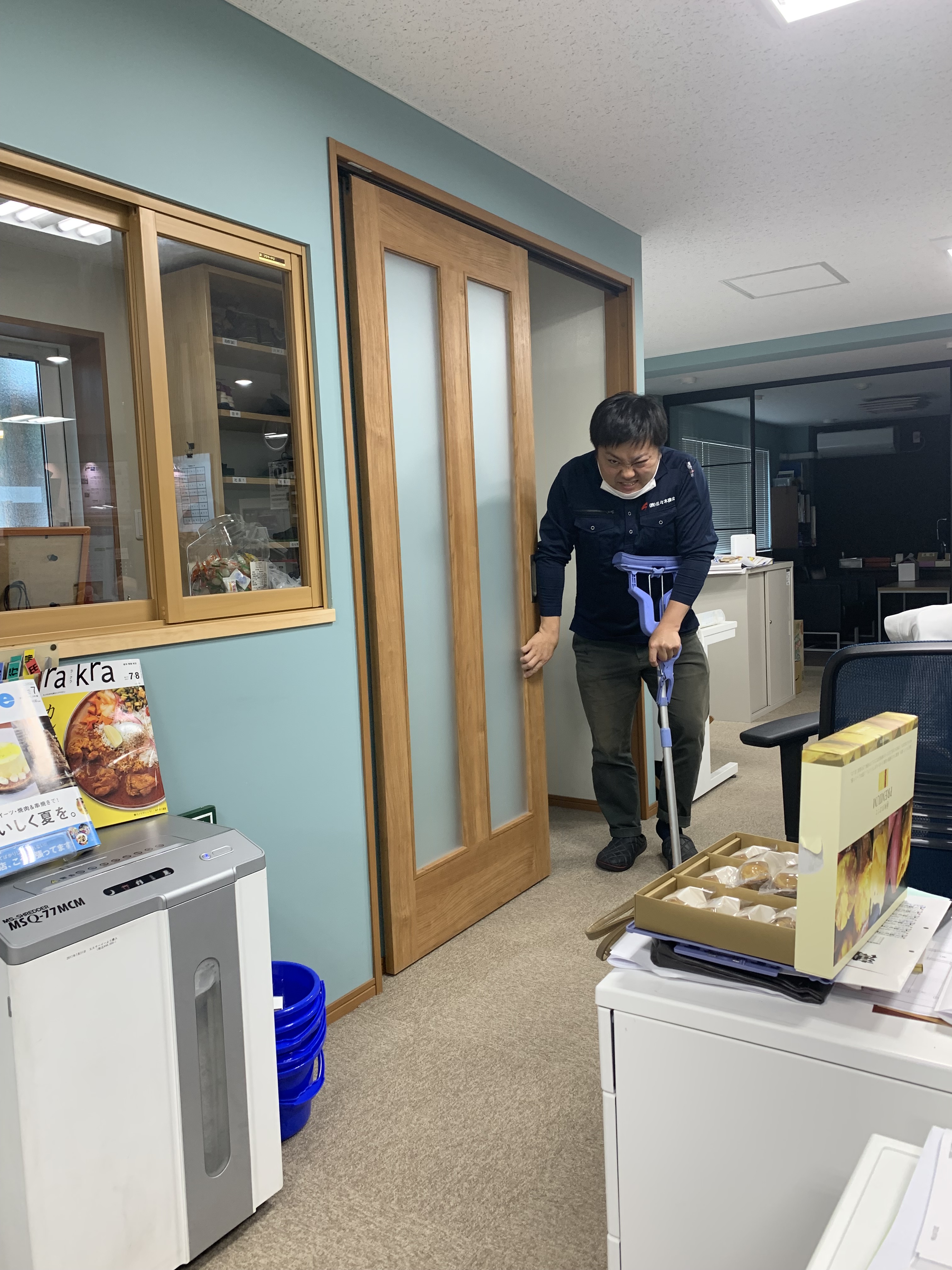 松葉つえ代わりに優しい社員が、持ってきてくれたモップ(水切)をつえ代わりに(笑)
