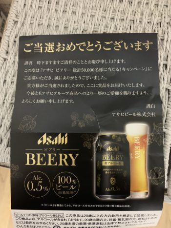 新商品の微アルコールビールが1ケース当たったようです。
