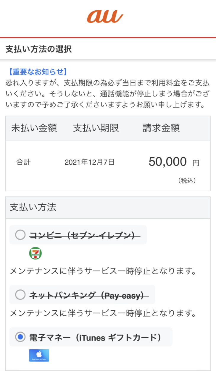 ここでお気付きの方もいるかもしれませんが、支払期限が当日で尚且つ支払い方法が電子マネー(iTunes ギフトカード)のみとなっております。