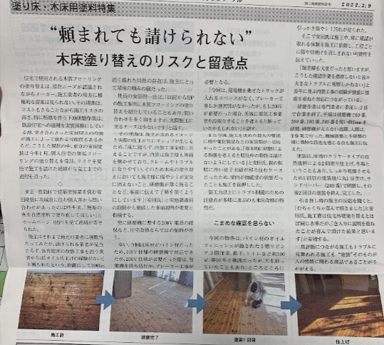 東京・豊島区で建築塗装業を営む安 田塗装に茨城県に住む個人客から問い合わせがあったのは昨年末。 「無垢の床を自然塗料で塗り直してほしいとホームページ (HP) を見て連絡が寄せられた。