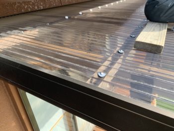 落雪や寒暖差による膨張、様々な影響でポリカを止めている部材が破損しており、止金具をステンレス製の止金具に交換しました。