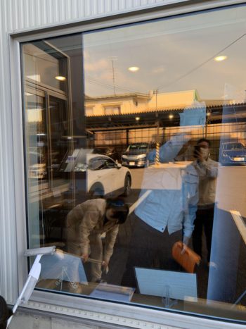 この窓の中側でももう一人が雑巾と窓清掃用の洗剤を使って拭いてくれています。