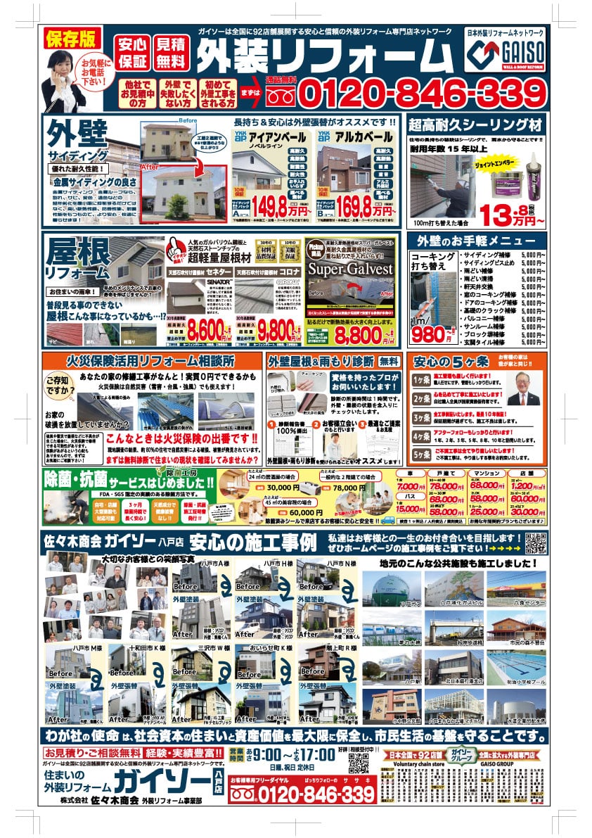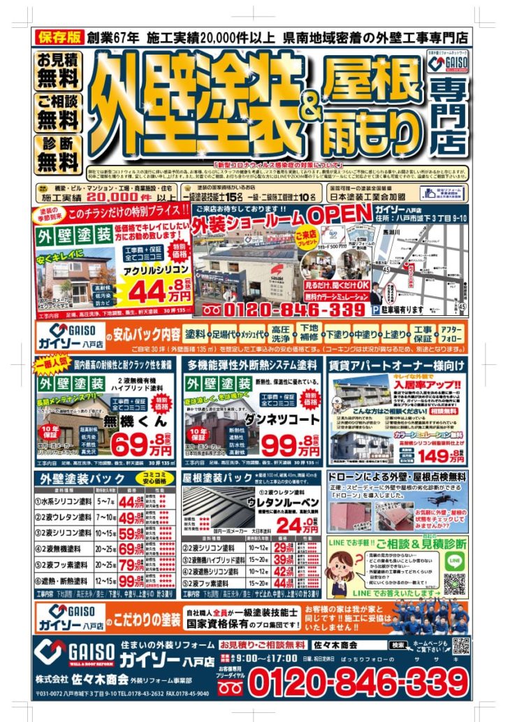 HOME最新チラシ・イベント2020年夏 塗装シーズン本番!! 2020年夏 塗装シーズン本番!!(終了しました) ~大切なお客様へのご案内~ 新型コロナウイルスの流行に伴い通常はご在宅時に合わせて建物診断・お見積りをお願いしておりましたが、ご不在時の建物診断・お見積りの受け付け対応を開始致しました。 ご希望の方には、LINEやスマホビデオ通話を用いて診断結果やお見積内容をご説明することも可能です。 お気兼ねなくお申し付けくださいませ。 また、すべてのお客様の健康を配慮し、マスクの着用にて対応させていただいております。 ご理解のほどよろしくお願いいたします。 ご不在でも建物診断・お見積りを承っております。 一言 2020年夏 塗装シーズン本番!! どしどしお電話、ご来場お待ちしております。 最新チラシ・イベント一覧はこちら 佐々木商会について 会社案内代表挨拶企業理念会社概要アクセスマップ 選ばれる理由 表彰実績一覧 職人紹介 スタッフ紹介 最新チラシ・イベント 一覧 メディア実績 一覧 アフターサービス ブログ 施工事例 施工事例一覧 色/カラー別の施工事例 グレー・ブラック系 ブラウン系 イエロー・オレンジ系 レッド・ピンク系 ブルー系 グリーン系 ホワイト系 2色以上 戸建て 外壁リフォーム 屋根リフォーム 外壁・屋根リフォーム 内装リフォーム 雪止め設置 雨漏り修理 アパート・マンション 工場・商業施設 工場 商業施設 公共実績 公共施設の外壁塗装 公共施設の設備工事 床塗装 JR工事実績 お客様の声 お客様の声一覧 お役立ち情報 外壁診断 無料雨漏り診断 価格表 ジョイントエンペラー よくある質問 リフォームの流れ 工場・商業施設の塗装 お問い合わせ お問い合わせ 無料お見積もり 資料請求 TOPへ戻る ホーム 佐々木商会について 会社案内代表挨拶企業理念会社概要アクセスマップ 選ばれる理由表彰実績一覧職人紹介スタッフ紹介最新チラシ・イベント 一覧メディア実績 一覧アフターサービスブログ 施工事例一覧 お客様の声一覧 お役立ち情報 外壁診断無料雨漏り診断価格表ジョイントエンペラーよくある質問リフォームの流れ工場・商業施設の塗装 お問い合わせ お問い合わせ無料お見積もり資料請求 Copyright © 2017 佐々木商会 All Rights Reserved.