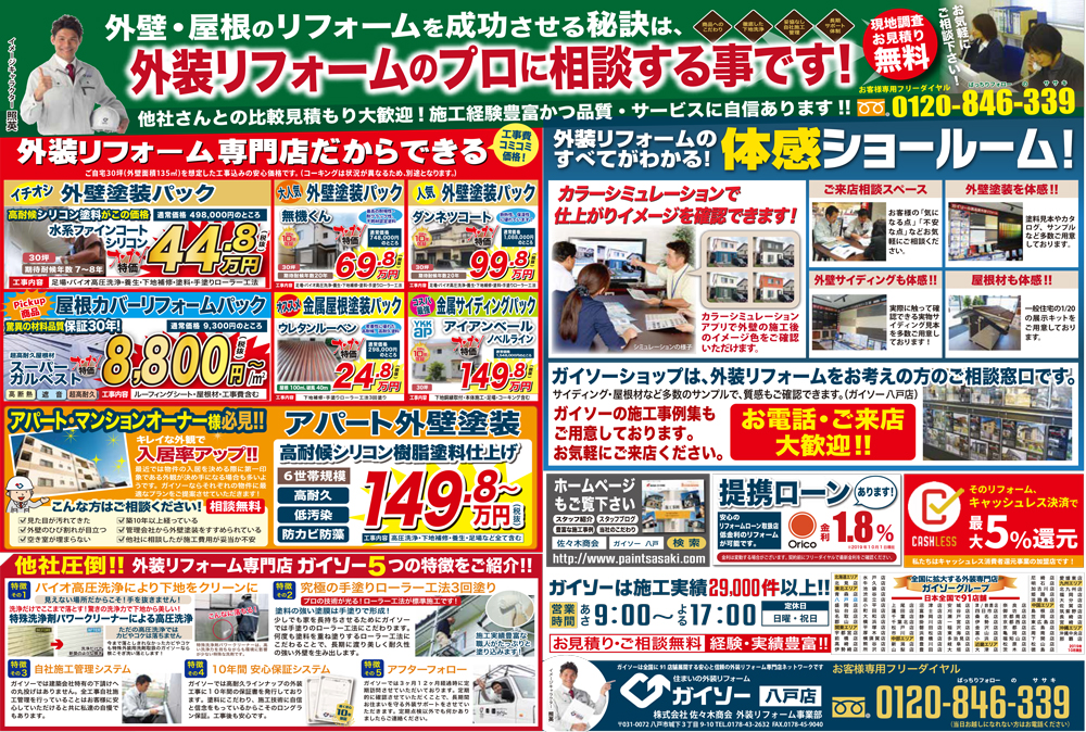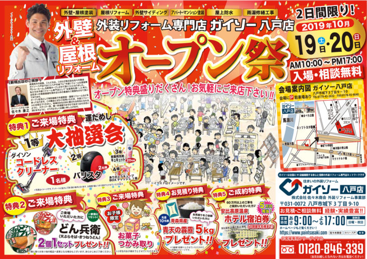 HOME最新チラシ・イベント最新チラシガイソーオープン祭 ガイソーオープン祭(終了しました) 一言 2019年10月19日(土)20日(日)の2日間限定のガイソー八戸店オープン祭です。ダイソンやバリスタが当たる、ご来場特典の大抽選会も。週末は是非ガイソー八戸店へ。 最新チラシ一覧はこちら 最新チラシ・イベント一覧はこちら 佐々木商会について 会社案内代表挨拶企業理念会社概要アクセスマップ 選ばれる理由 表彰実績一覧 職人紹介 スタッフ紹介 最新チラシ・イベント 一覧 メディア実績 一覧 アフターサービス ブログ 施工事例 施工事例一覧 色/カラー別の施工事例 グレー・ブラック系 ブラウン系 イエロー・オレンジ系 レッド・ピンク系 ブルー系 グリーン系 ホワイト系 2色以上 戸建て 外壁リフォーム 屋根リフォーム 外壁・屋根リフォーム 内装リフォーム 雪止め設置 雨漏り修理 アパート・マンション 工場・商業施設 工場 商業施設 公共実績 公共施設の外壁塗装 公共施設の設備工事 床塗装 JR工事実績 お客様の声 お客様の声一覧 お役立ち情報 外壁診断 無料雨漏り診断 価格表 ジョイントエンペラー よくある質問 リフォームの流れ 工場・商業施設の塗装 お問い合わせ お問い合わせ 無料お見積もり 資料請求 TOPへ戻る ホーム 佐々木商会について 会社案内代表挨拶企業理念会社概要アクセスマップ 選ばれる理由表彰実績一覧職人紹介スタッフ紹介最新チラシ・イベント 一覧メディア実績 一覧アフターサービスブログ 施工事例一覧 お客様の声一覧 お役立ち情報 外壁診断無料雨漏り診断価格表ジョイントエンペラーよくある質問リフォームの流れ工場・商業施設の塗装 お問い合わせ お問い合わせ無料お見積もり資料請求 Copyright © 2017 佐々木商会 All Rights Reserved.